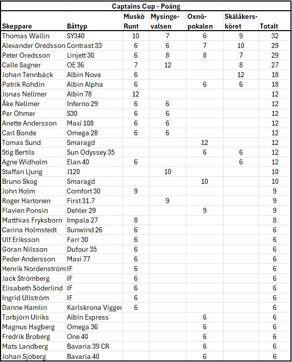 Captains Cup är öppen för alla – inte bara medlemmar i de tre arrangerande klubbarna – och alla seglare är varmt välkomna att vara med. Varje kappsegling avslutas traditionsenligt med prisutdelning och fina priser från vår sponsor Erlandssons Brygga i Albyberg samt gemensam grillning där vi bjuder på hamburgare, korv och dryck.